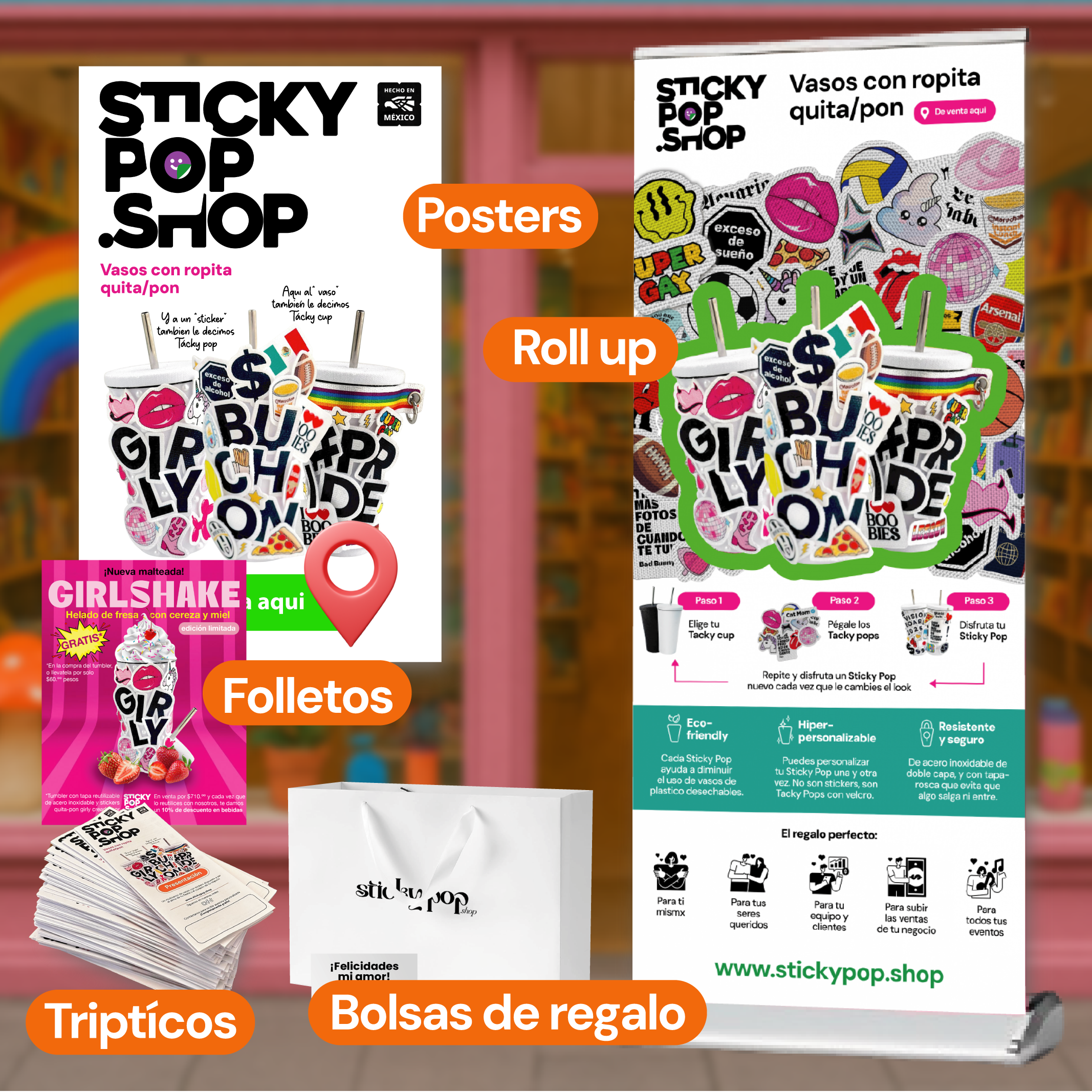 También podemos hacerlo. Todos nuestros productos se venden por separado para su venta individual. Solo entra en stickypop.shop, haz tu pedido, aplica tu descuento, y recibe el material listo para que lo exhibas y revendas.